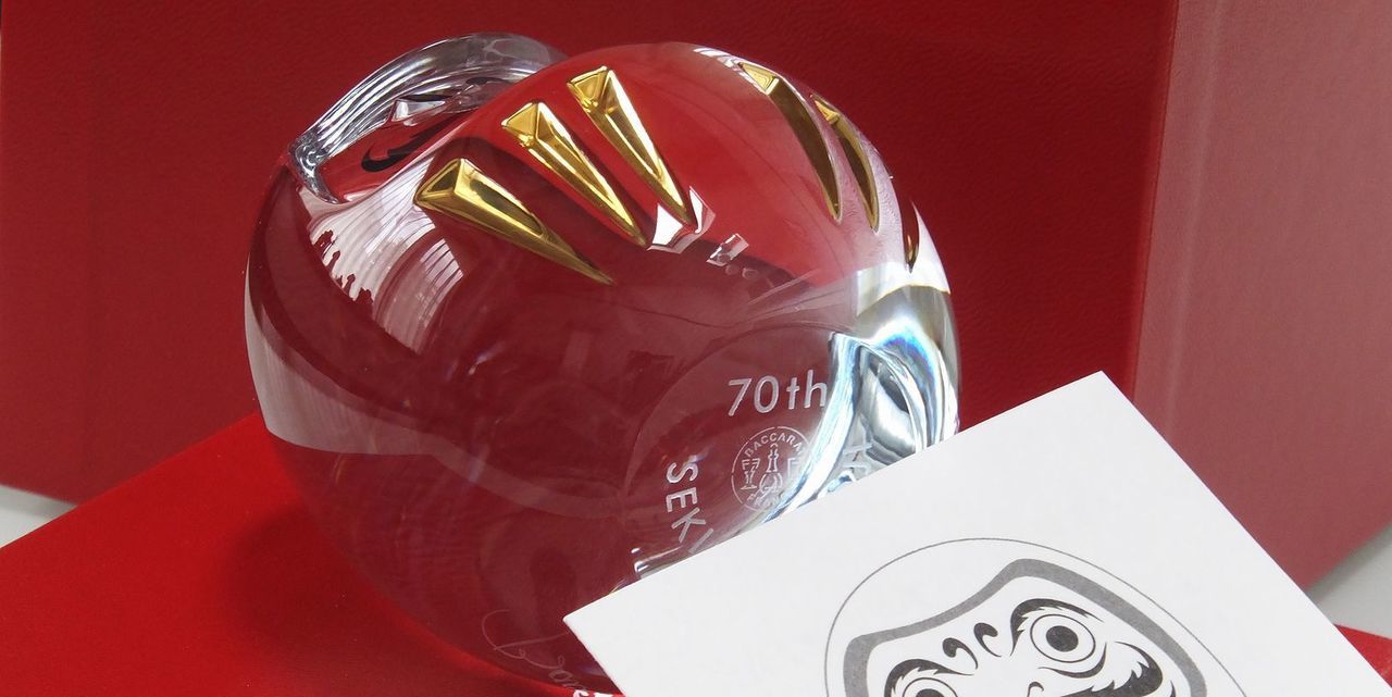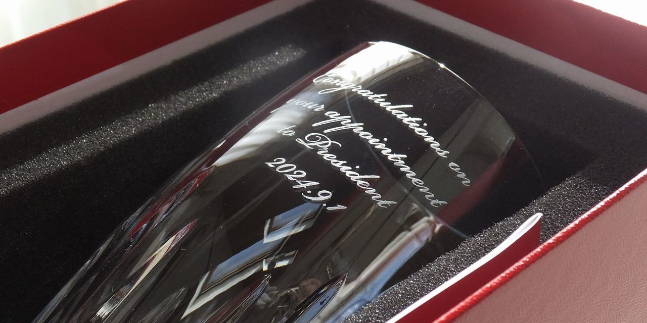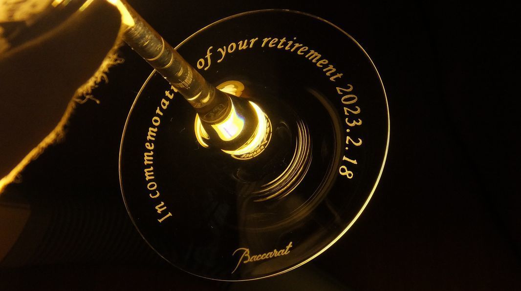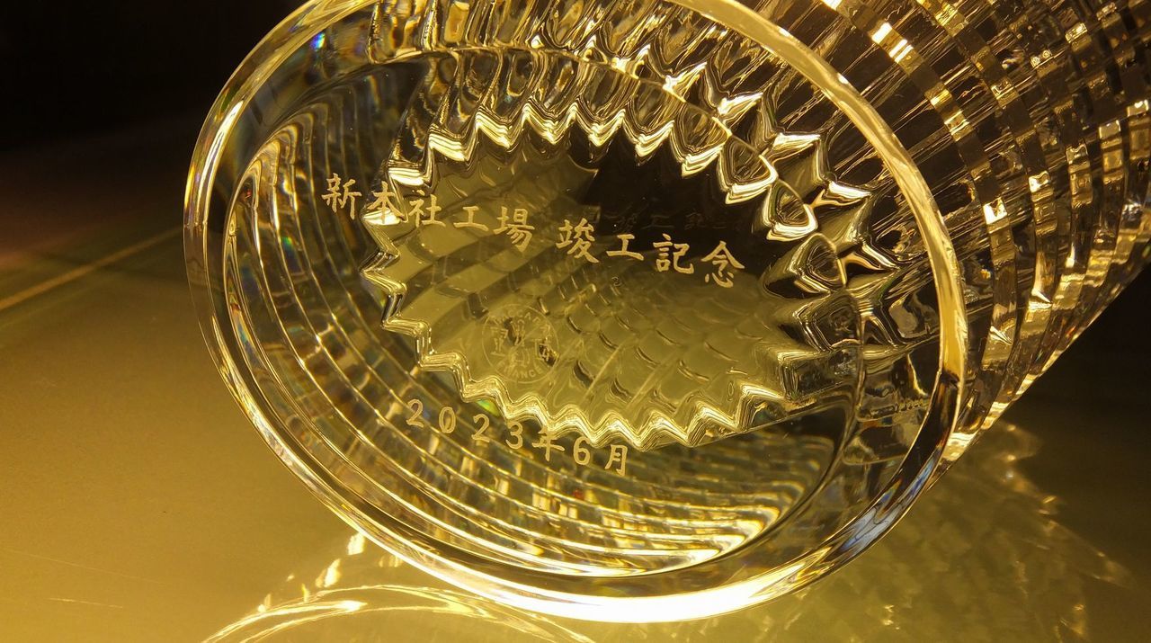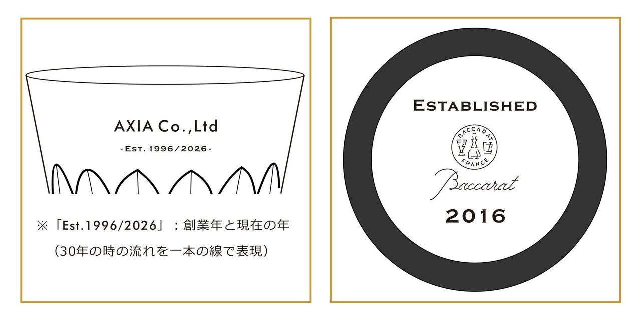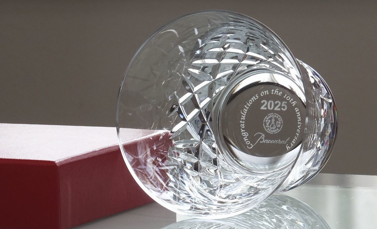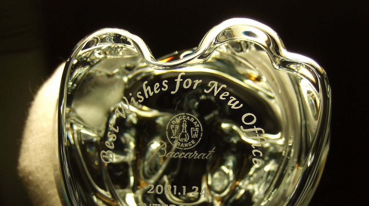 役職や賞名を記号化。バカラの底面に小さく刻むことで、非常に現代的で価値のあるギフトになります。